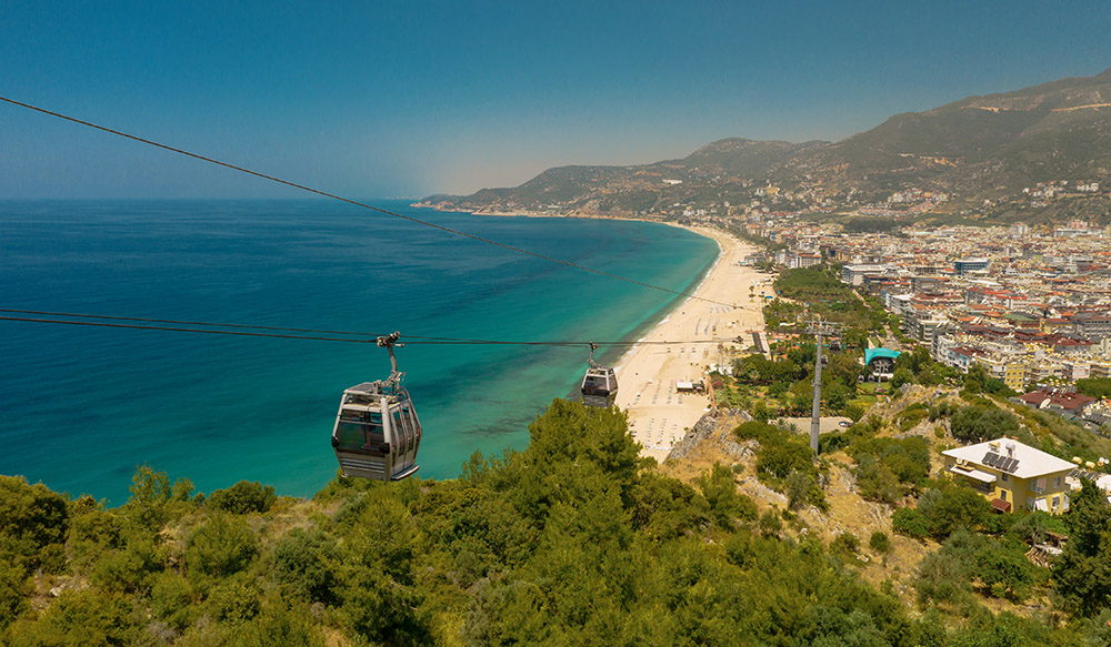 Horizontal shot of a mysterious town on a cliff with a white turned-on lighthouse during dusk